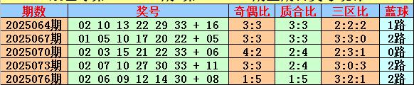 双色球在第2025064期-第2025076期周日开奖中,红球奇偶比累计为14:16,基本持平;红球质合比累计为11:19,与理论比基本相当;红球三区比累计为13:10:7,红三区开出比例较低,红一区出号比例较高。