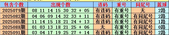 双色球在第2025079期-第2025091期周日开奖中,有4期奖号包含连码组合,连码出现比例较高;重号连开出5期,走势非常活跃;同尾号码开出了4次,出现比例较高。