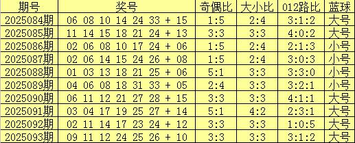 双色球第2025093期开奖号码:091112242526+10。红球大小比为3:3,奇偶比为3:3,012路比为3:1:2,蓝球为大号。
