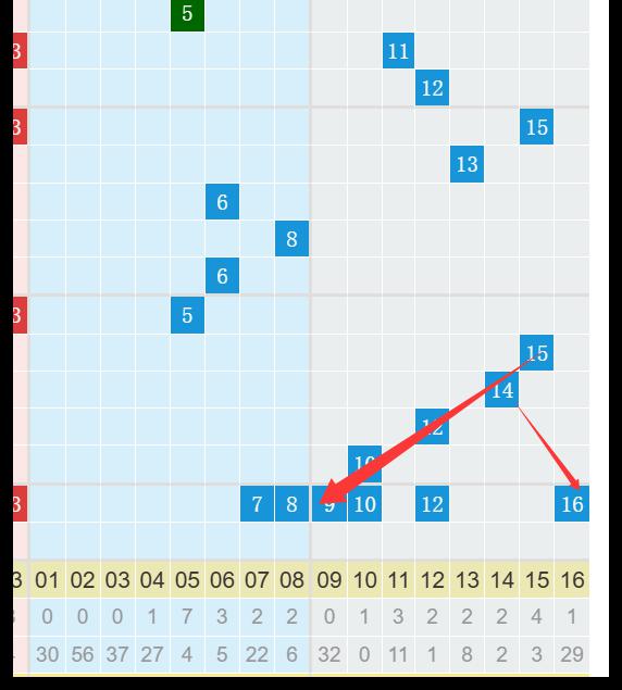 最后,我们看一下双色球蓝号上一期开了一个斜连10.12.14.本期蓝号难度依然很大,这个蓝号大概是回不到这个小号了。我们主要防一下这个贴边09,还有重号10号。这个贴边09呢,也是九十二十五的斜连这个重号也有可能蓝号走到这个位置进行重复直落。其次,我们要防一下往大号走的一个可能,但是这种可能可能性也是有的,但是可能性不是很大。往大号旋转,我们主要是看一下12号,以及冷号16