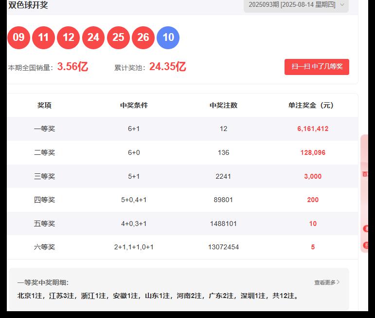 大家好,今天是2025年8月16日,那么双色球游戏呢,在明天8月17日星期日进行094期开奖,那么双色球上一期093期全国一等奖共开出12注,单注奖金616万。二等奖开出136注,单注奖金12.8万。