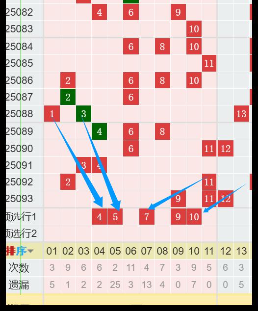 那么接下来对于094期红球进行分析,首先看一下一分区,我们看一下01~11上一期开了一个0911的组合,那么本期的话,我们要看一下小号走势。小号的走势主要的时候关注07。这么冷号,同时也是一个斜连号,那么07的如果是组合的话,大概是有040507,还有070910,所以说一分区大概也开不了这么多号码。可能会有一到两个