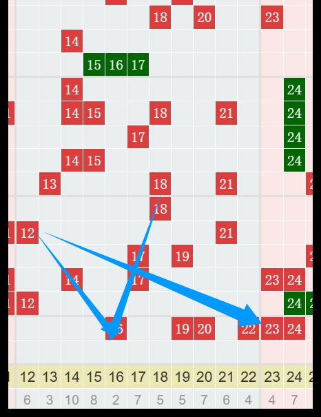 接着我们进行二分区的分析,上一期只开了一个12号,本期二分区。可能的话会有产生1~2个号码,甚至会有组合号码产生,我们主要的是关注16.19.20以及冷号22。那么通过走势图我们都可以发现,16号呢,也是一个斜连号,同时呢,也是一个冷号。那么16.19.20.进行组合是完全有可能的,那么19.20这个这个对子呢,也是一个很久没有开出来了。但是要防一下22号这期可能会有222324这样的三连
