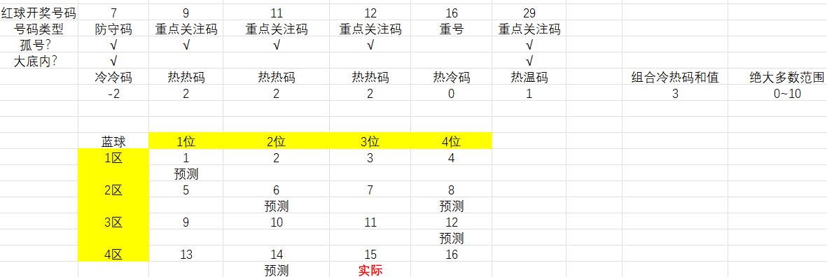 公式:【重号0~2个+重点关注码1~5个+防守码(备选)0~4个+其他类号码0~3个】,孤号2~4个,也是经过了两百多期的验证,通用率95%以上,可以和上面的组合冷温热码范围配合着选,如果有号码属于两种类型,那两个类型号码都计数一次