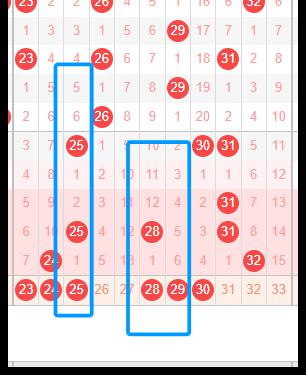 最后呢,我们分析一下三分区23~33这个区间的号码。上一期开了两个偶数24和32。那么本期的话,我们重点关注一个非常关键的号码24号。那么24号这个地方呢,很容易形成三连号232425。其次我们要关注一下尾号2829。那么本期的话,凤尾我们还是要关注28.29作为一个结尾。