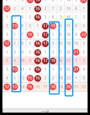接着呢,我们来看一下双色球二分区。也就是12~22这个区间的号码,上一期开出了一对连号15和16号,那么本期的话,二分区域我们考虑号码可能只有一到2个。大概率是一个号码,那么主要的话,我们是要考虑隔期号13以及18和20这几枚号码,重号关注15号。
