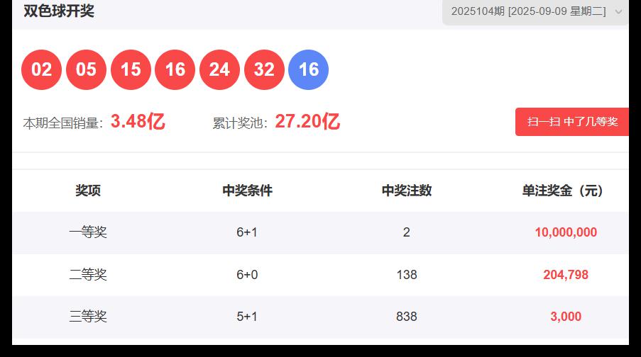大家好啊,我是算王,一个热爱彩票的作者。今天和大家一起聊一下双色球第105期,那么首先我们看一下104期双色球一等奖共开出两注,单注奖金1000万。二等奖开出138注,单注奖金20.4万。接下来,我们一起来分析一下105期的各个分区重点号码。