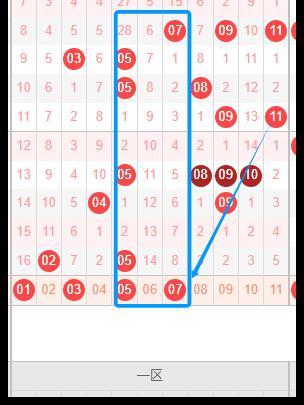 接下来我们看一下一分区。上一期一分区只开出了02和05两枚号码。那么本期的话,我们首先要考虑边以及重号斜连号码。那么得出的号码有1357这四个奇数号码,这是一分区,大家要重点关注的四枚号码。其中重点关注重号05,还有斜连号07