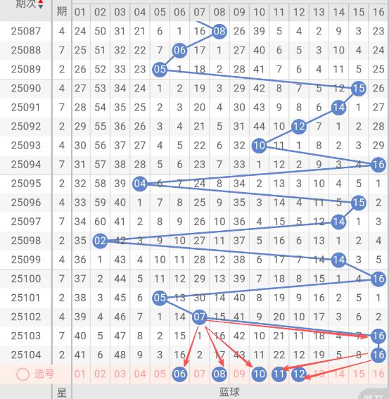 根据走势图近10期的走势看,蓝球在094期开出16蓝球之后,1小2大1小2大1小1大,再看下近10期的蓝球中冷码有回补的趋势,这种趋势规律本期判断极有可能开出小号,本期防蓝球13大号,蓝球本期重点关注06,08,10,11,12