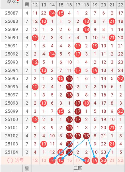 根据走势图可以看出当前区段,095期开出了15.16.22一个号码球,096期开出了12.16二个号码球,097期开出了16一个号码球,098期开出了13.17.18三个号码球,099期开出15.17.22三个号码球,100期开出了12.16.17三个号码球,101期开出了16.21二个号码球,102期开出了16.17.18三个号码球,103期开出13.16.21三个号码球, 104期开出了15.16二个号码球,按照如此规律本期当前区可能开出1单1双。我们看下当前区上期开出16重叠号,那么本期当前区要定重叠号的情况下可关注15号码球。再看下当前区上期开出15斜连号,当期选号得留意斜连14号码球。本区重点关注14.15.18.19.20
