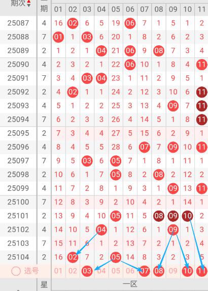 根据走势图可以看出当区段,095期没有开出码球,096期开出07.09.11三个号码球,097期开出了03.05一个号码球,098期开出了05.08二个号码球,099期开出09.11二个号码球,100期没有开出号码球,101期开出了05.08.09.10四个号码球, 102期开出了04.09二个号码球,103期没有开出码球,104期开出了02.05二个号码球,按照如此规律本期当前区可能会开出1单1双或2单。我们看下当前区上期没有开出重叠号,那么本期当前区要定重叠号的情况下可关注05号码球。再看下当前区段上期没有开出斜连号,当期选号得留意03斜连号。建议重点关注03.07.08.10.11
