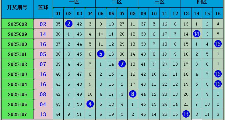 上期蓝球开出号码13,近十期蓝球在一区开2枚,二区开出号码3枚,三区开出0枚,四区开出5枚,区间比2:3:0:5,本期推荐蓝球出现在三区,重点关注09。