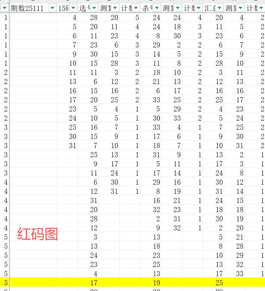 得出一组红码数据就是:4 5 6 7 9 10 11 13 16 17 23 24 25 30 31