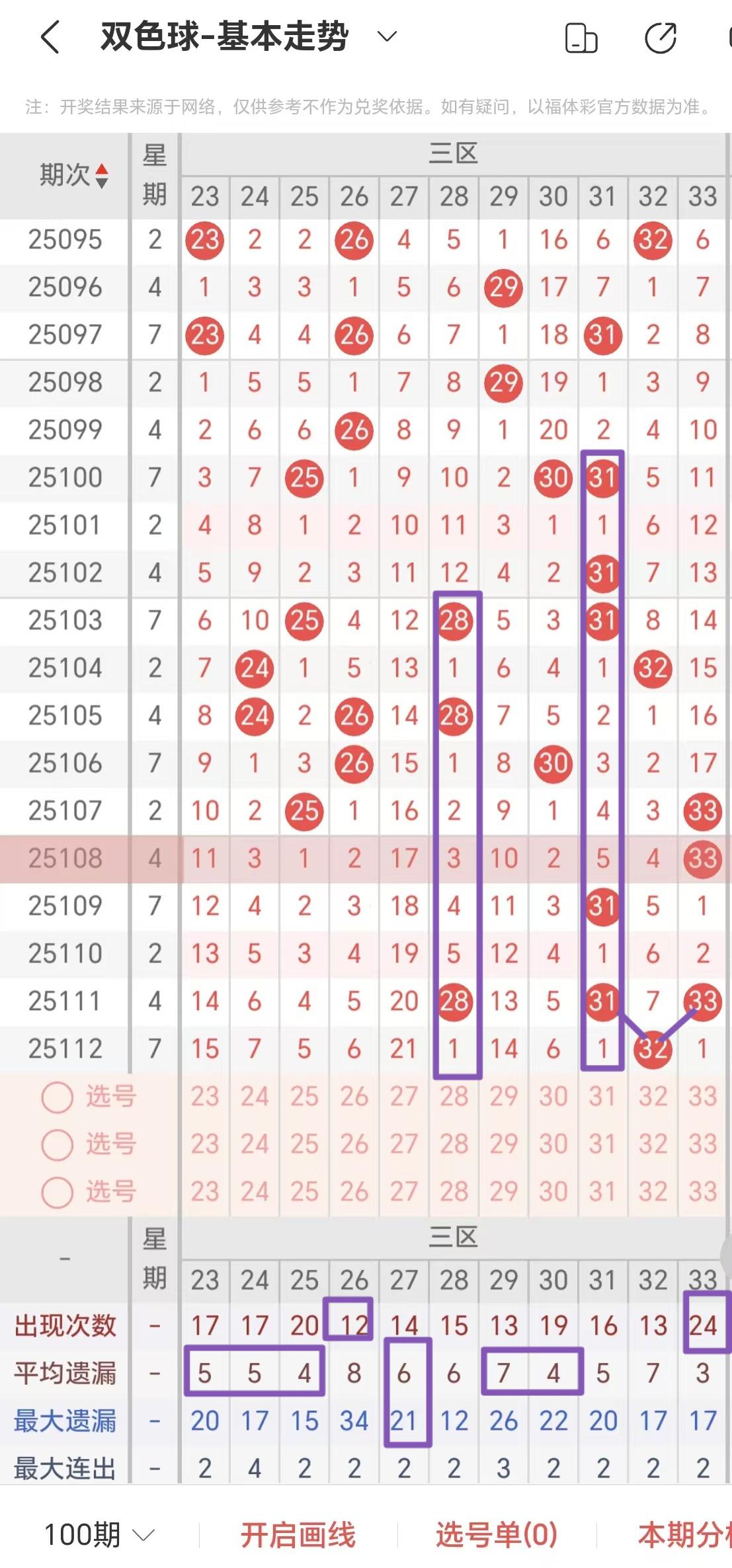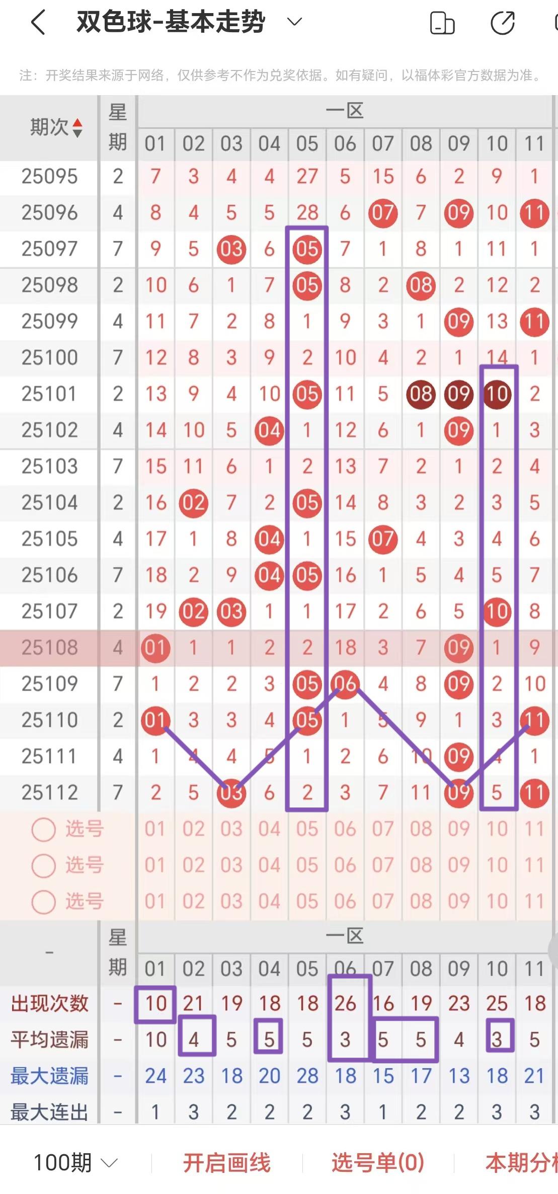 >本期一区红色球号码分析完毕,接下来进入二区红色球号码分析!