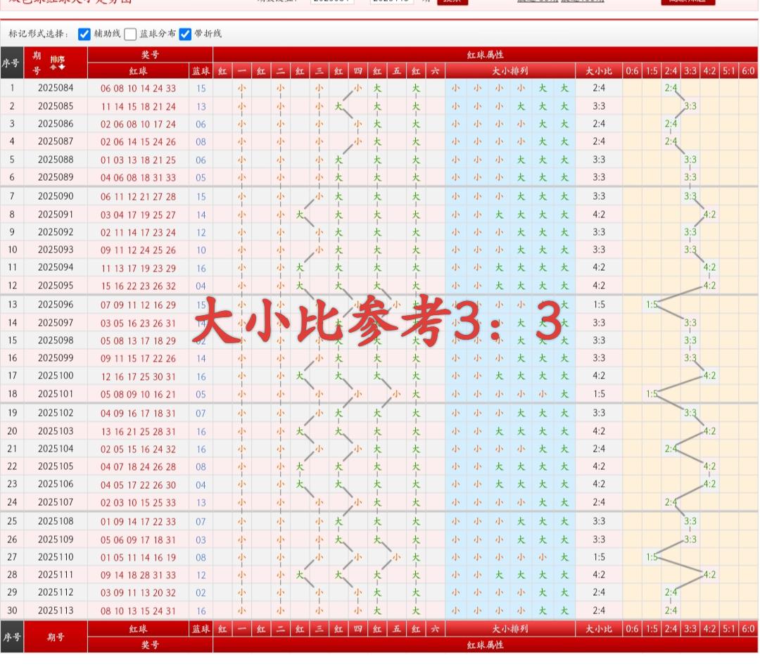 红球大小方面:小数为【01到16】,大数为【17到33】,上期开出大小形态为2:4,小数出号四个,大数出号二个,本期看好小数出号继续走热,综合最近30期数据分析形态0:6一次没有出现,形态1:5开出过三次,形态2:4开出过七次,形态3:3开出过十三次,形态4:2开出过八次,形态5:1开出过二次,形态6:0一次没有出现,其中形态0:6,形态1:5,形态5:1,和形态0:6这四个形态开出过次数较少属于偏冷状态我们可以不用考虑太多以防为主还是以热形态为主,其中形态3:3开出过次数最多也是最热的需要注意一下,红球第一位小数出号30期以上本期继续看好小数出号,红球第二位小数出号47期,本期这两个位置继续看好小数同出,本期注意第三位小数出号开出,大家需要多参考热的东西冷的东西不要去追,红球第六位大数出号已经30期以上本期继续看好大数,红球第五位上期大数出号,本期第五位和第六位继续看好大数同出,上期第四位开出大数出号,本期要想判断它的大小形态需要通过第三位去看,114期大小方面参考形态3:3
