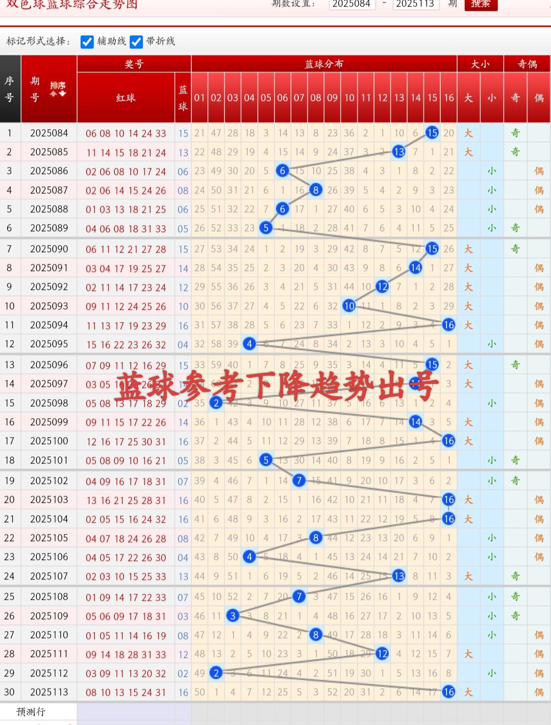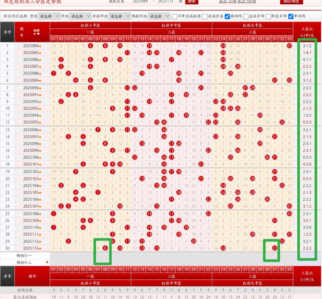 红球综合方面:一区为【01到11】,二区为【12到22】,三区为【23到33】,上期开出三区比为2:2:2,一区出号二个,二区出号二个,三区出号二个,其中三个区段出号个数一样多,本期重点关注一下二区和三区出号个数继续走热,最近几期一区出号个数较多较热需要注意一下,最近几期一区和二区出号个数较多需要注意一下,本期需要注意一下一区和二区出号继续走热,本期需要注意三区出号回补,通过最近七期数据一区出号个数比较多需要注意一下二区出号继续走热,综合最近30期数据分析此形态一共开出过七次,开出过次数较多较热,本期可断此形态,114期应该不会有断区出现,需要防三区和二区出号继续走热,上期龙头开出08为上升走势出号,龙头出号偏小,本期龙头需要注意防下降走势出号看好小数继续出号,上期凤尾开出31为下降走势出号,上期龙头和凤尾形成首尾跨度为23,本期需要注意凤尾上升趋势出号,本期重点关注一下凤尾3字头继续开出,本期需要注意龙头下降走势出号,凤尾上升趋势出号