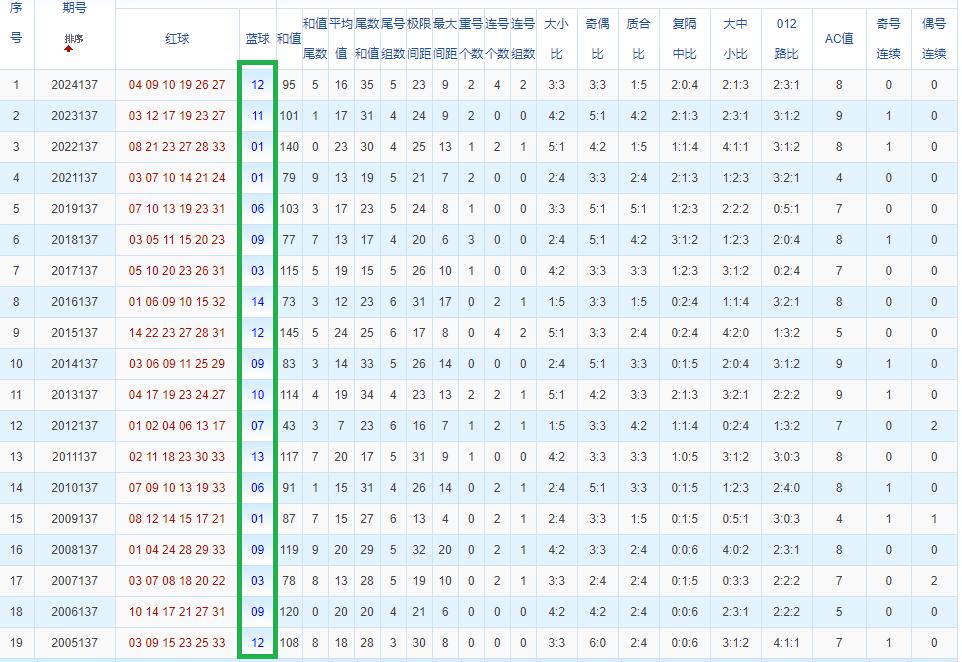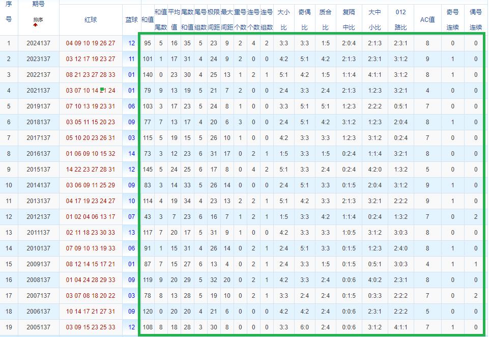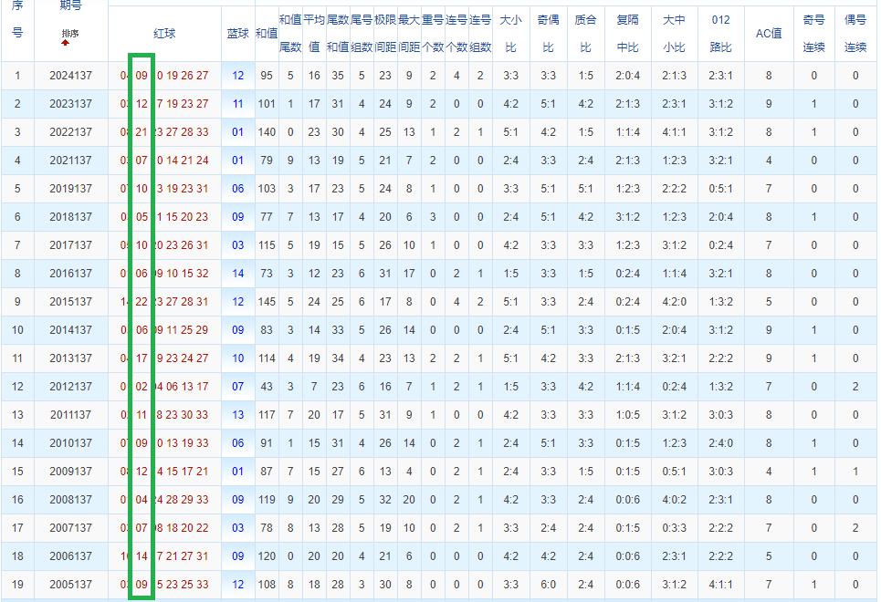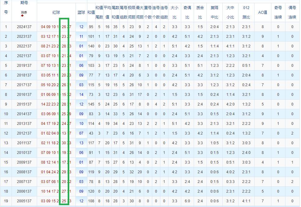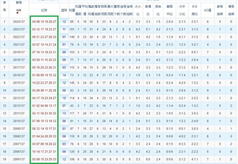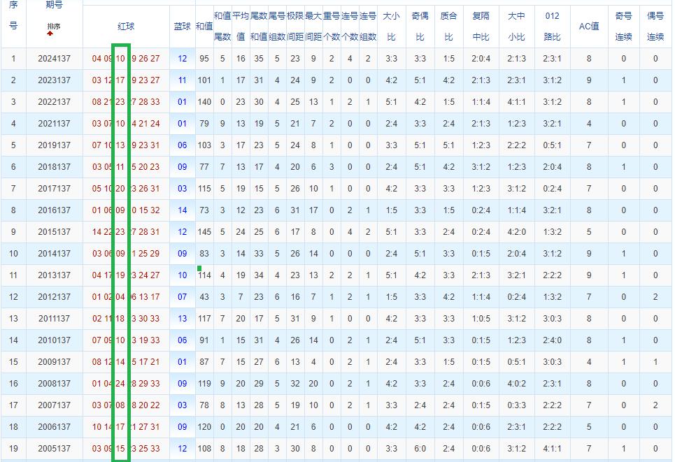 通过观察,我发现双色球往年同期的开奖数据与本期号码之间存在显著关联。具体来说,在红球中,从第一位至第六位,通常会有约4个位置上的数字与往年同期相同位置的号码一致;而蓝球号码中,也有多期开奖结果直接包含了往年同期的数字。因此,我们可以借助往年同期各位置上的号码,作为分析本期开奖情况的重要依据。在此基础上,还可结合往年同期的其他相关条件,进行综合性的号码组合推荐。