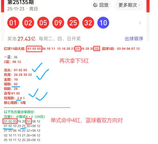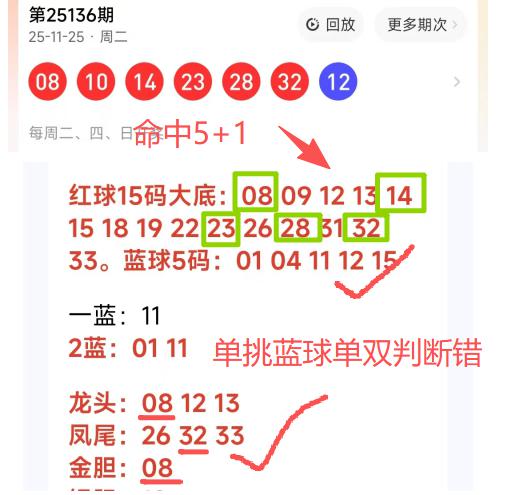 先回顾上期开奖号码:08 10 14 23 28 32—12,上期大底命中08 14 23 28 32+12。连续3期拿下5红,蓝球五码围到12等。