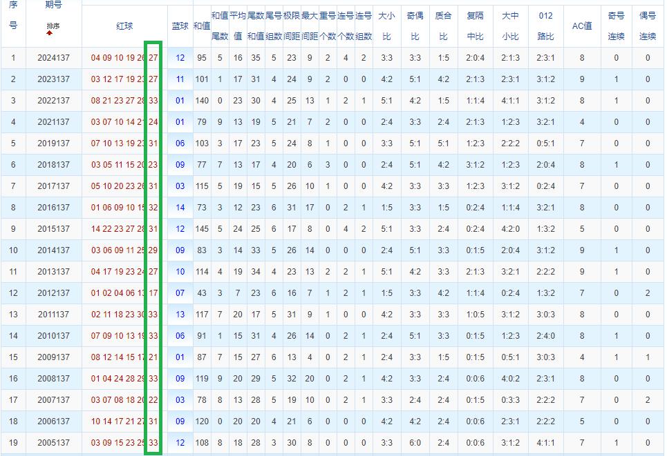 往年同期中选取出现次数靠前的数作为我们的分析对象,其数据有:23 10 27 03等