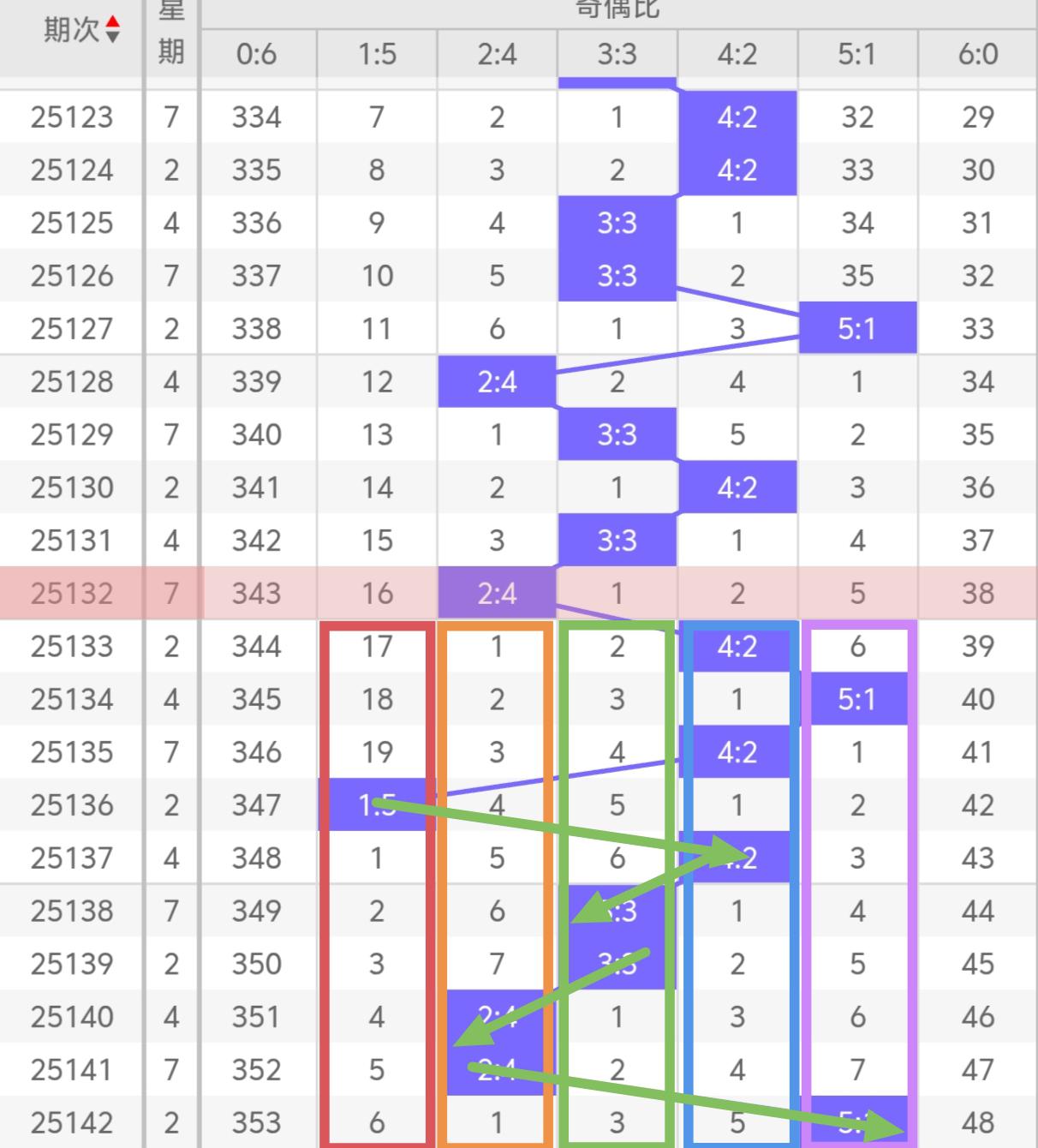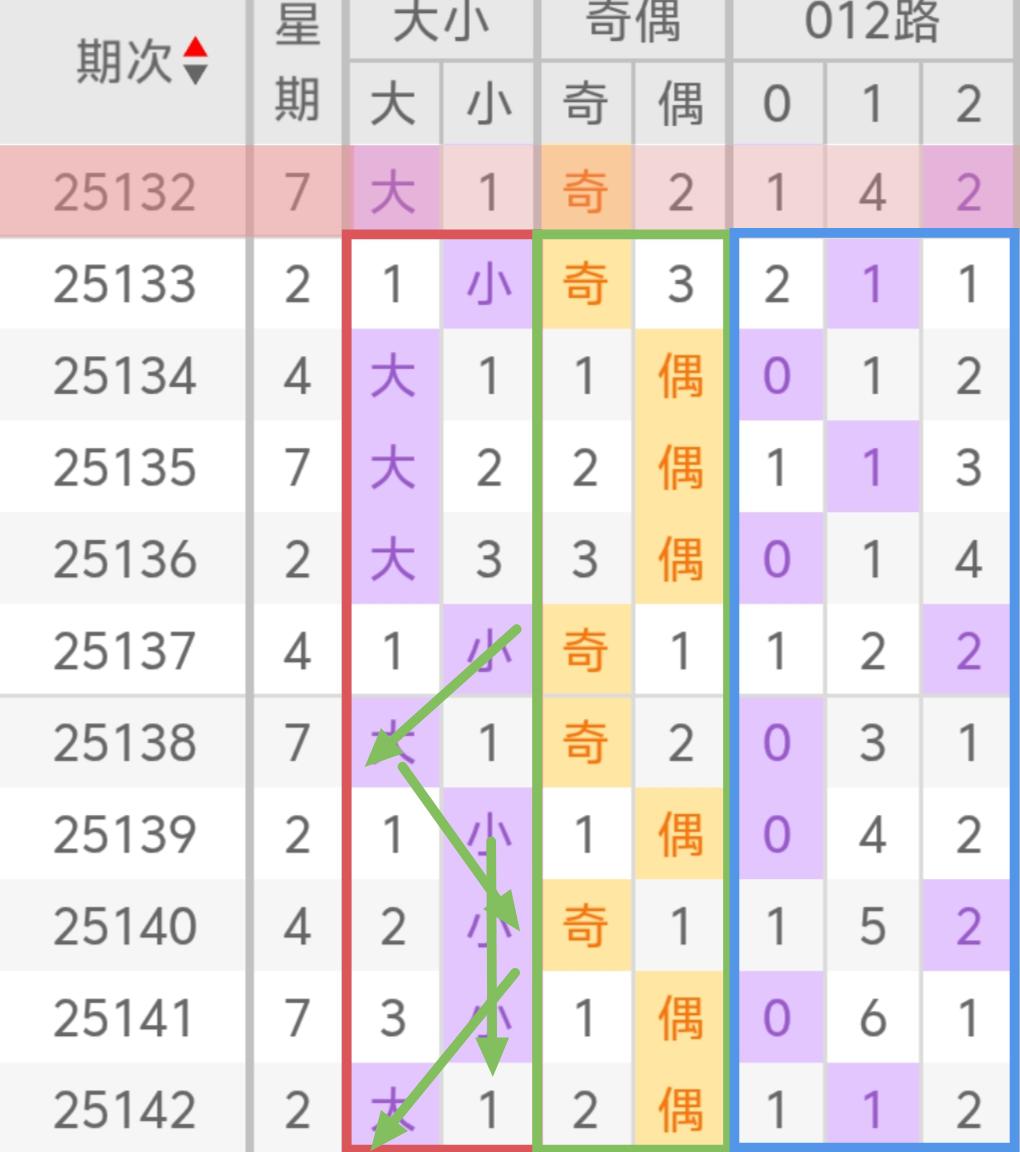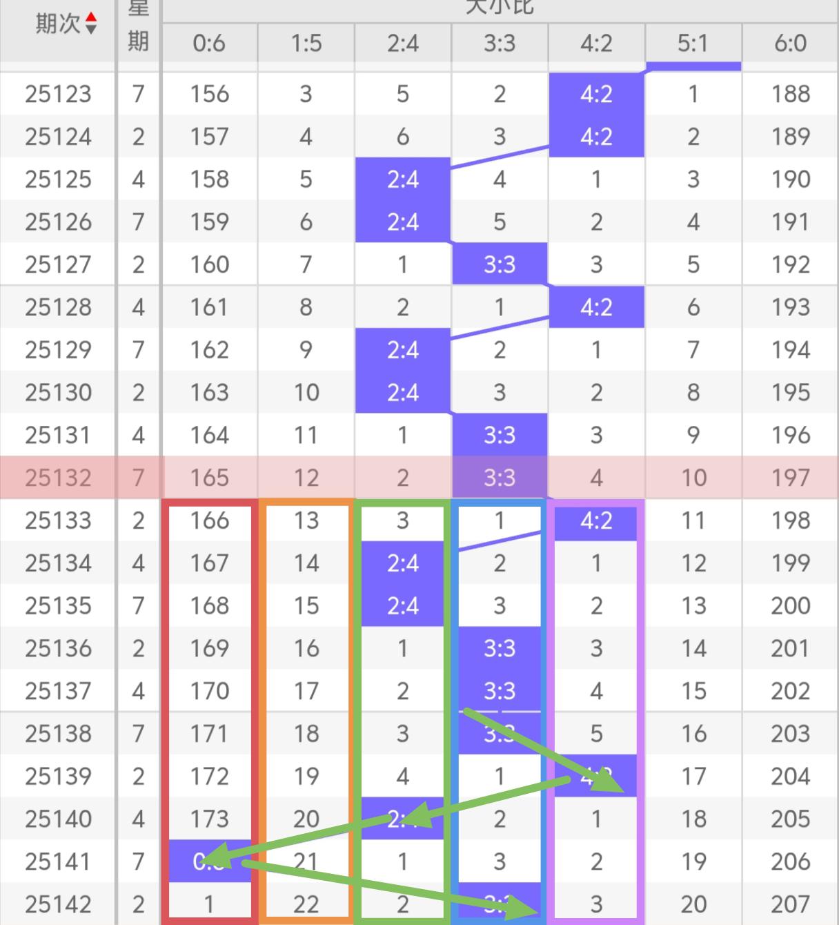 往期大小走势上一般大小比3:3开出后会开大小比2:4和大小比3:3,综合考虑,本期关注大小比4:2,防3∶3