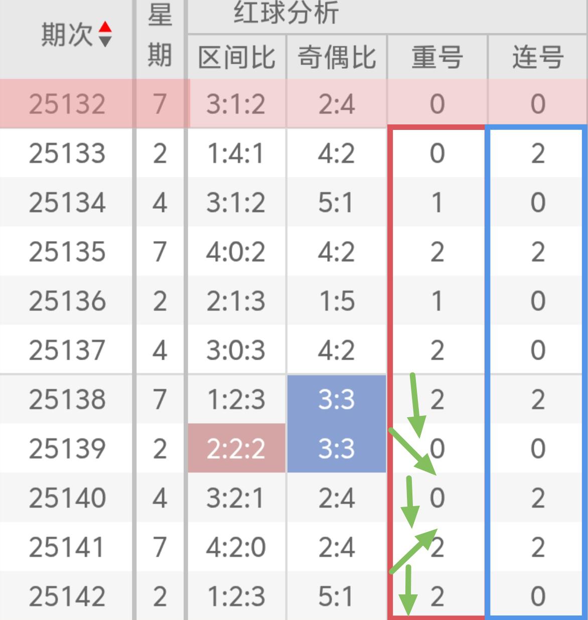 连号:从上图可以看出近20期前区连号出现的个数分别为220202020020220,近期连号出现的频率还是很高的,上期开出连号,本期看好连号会开出。
