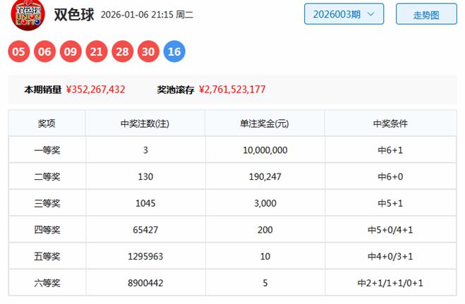 开奖回顾:第2026003期双色球奖号为05、06、09、21、28、30+16。区间比:3:1:2,奇偶比:3:3,首尾间距:25。