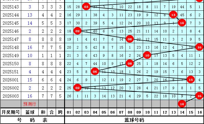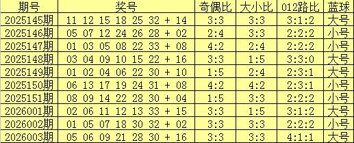 蓝球分析:上期蓝球为大号16,最近10期大小蓝球号码分别出现5次,走势相当,本期蓝球关注大号,推荐号码14。