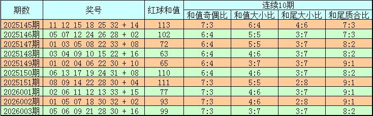 和值跨度分析:上期和值开出99,对比第2026002期和值上升了6个点位,本期预计和值在大号区域热出,看好出现在118附近。