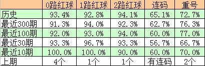 红球重号分析:重号红球在最近10期、30期和100期开出期数比分别为:70%、66.7%和77%,开出个数分别为:10个、31个和108个,上期红球开出2个重号:05、30,本期看好红球重号再出,预计出现1个,参考上期红球09。