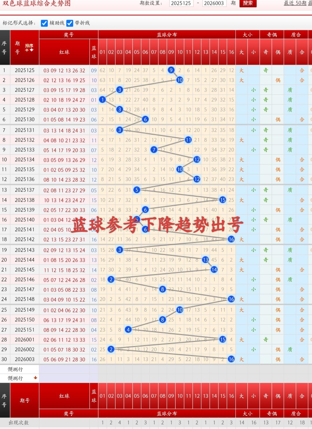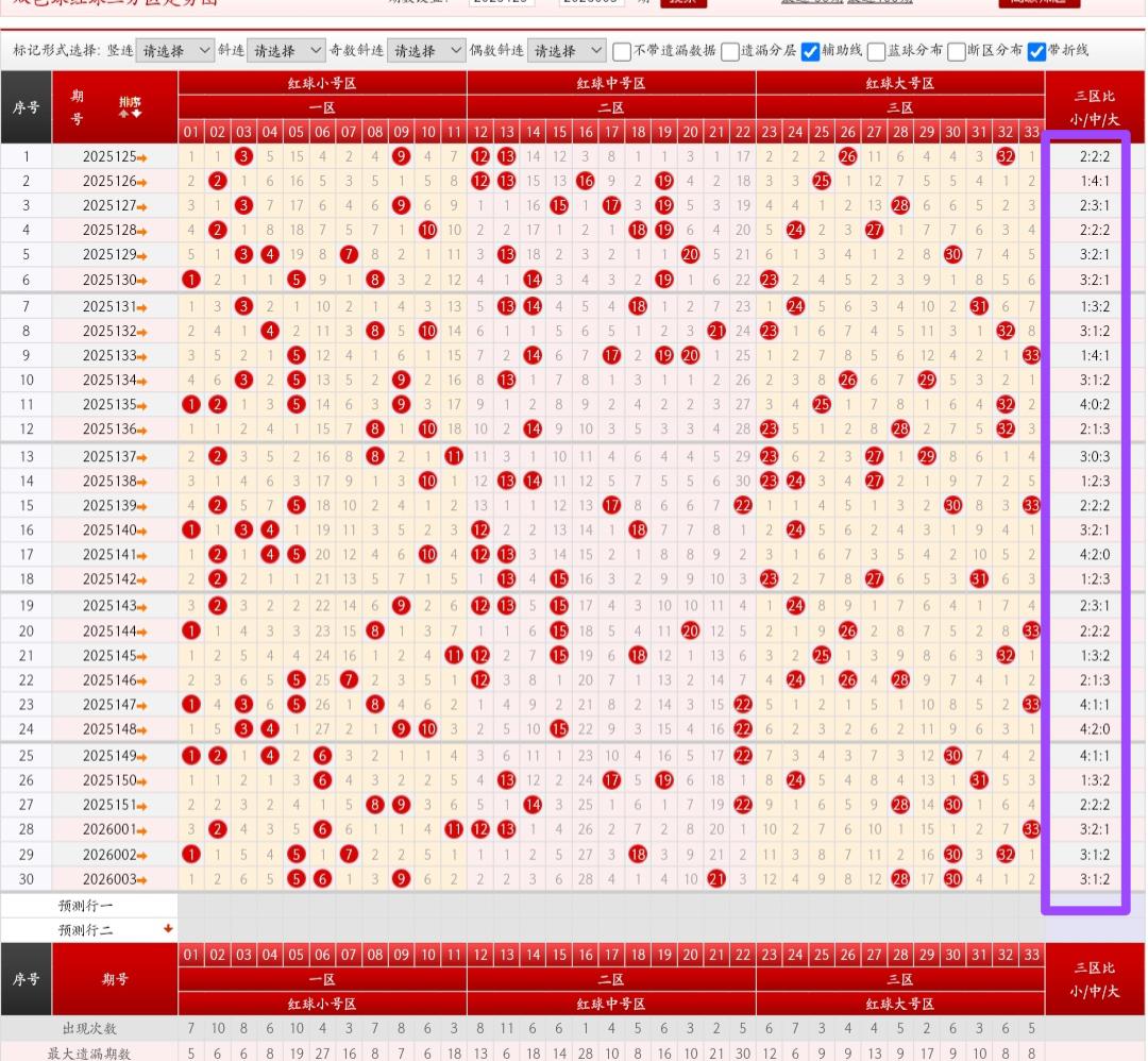 红球综合方面:一区为【01到11】,二区为【12到22】,三区为【23到33】,上期开出三区比为3:1:2,一区出号三个,二区出号一个,三区出号二个,其中一区出号个数最多,二区出号个数最少,本期重点关注一下二区和三区出号个数继续走热,最近几期一区出号个数较多较热需要注意一下,最近几期一区和二区出号个数较多需要注意一下,本期需要注意一下一区和二区出号继续走热,本期需要注意三区出号回补,通过最近七期数据一区出号个数比较多需要注意一下二区出号继续走热,综合最近30期数据分析此形态一共开出过四次,开出过次数较多较热,本期可断此形态,003期应该不会有断区出现,需要防二区出号回温走热,上期龙头开出05为上升走势出号,龙头出号偏小,本期龙头需要注意防下降走势出号看好小数继续出号,上期凤尾开出30为下降走势出号,上期龙头和凤尾形成首尾跨度为25,本期需要注意凤尾上升趋势出号,本期重点关注一下凤尾3字头继续开出,本期需要注意龙头下降走势出号,凤尾上升趋势出号
