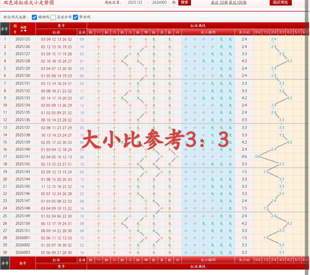 红球大小方面:小数为【01到16】,大数为【17到33】,上期开出大小形态为3:3,小数出号三个,大数出号三个,本期看好大数出号回补走热,综合最近30期数据分析形态0:6出现一次,形态1:5开出过三次,形态2:4开出过九次,形态3:3开出过十三次,形态4:2开出过六次,形态5:1开出过二次,形态6:0一次没有出现,其中形态0:6,形态1:5,形态5:1,和形态0:6这四个形态开出过次数较少属于偏冷状态我们可以不用考虑太多以防为主还是以热形态为主,其中形态3:3开出过次数最多也是最热的需要注意一下,红球第一位小数出号30期以上本期继续看好小数出号,红球第二位上期小数出号,本期这两个位置继续看好小数同出,本期注意第三位小数出号开出,大家需要多参考热的东西冷的东西不要去追,红球第六位大数出号已经30期以上本期继续看好大数,红球第五位上期大数出号,本期第五位和第六位继续看好大数同出,本期要想判断它的大小形态需要通过第三位去看,004期大小方面参考形态3:3