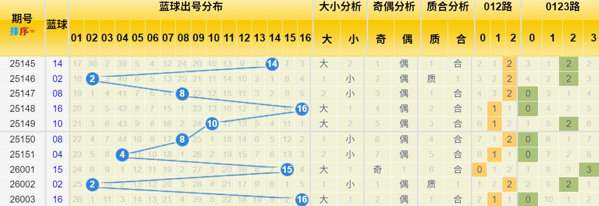2. 综合判断:尽管2路号码在双视角下均显强势,但连续开出3期的压力较大。同时,近期0路和1路号码也有回补需求。因此,本期蓝球选择可在延续2路热态的同时,兼顾回调的小号0路或1路。大小上,小号反弹可能性增加。