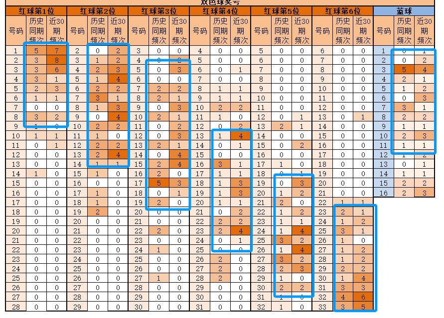 第6位,基本在24-33之间,历史同期频次最多的32;近30期,频次最多的为32,明显特征是合数优势;推荐重28-29-30-31-32-33。