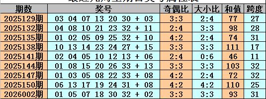 上期开奖:福彩双色球上期第2026004期奖号为:030708091832+10,红球号码奇偶比为:3:3,大小比为:2:4,和值为:77,跨度为:29。