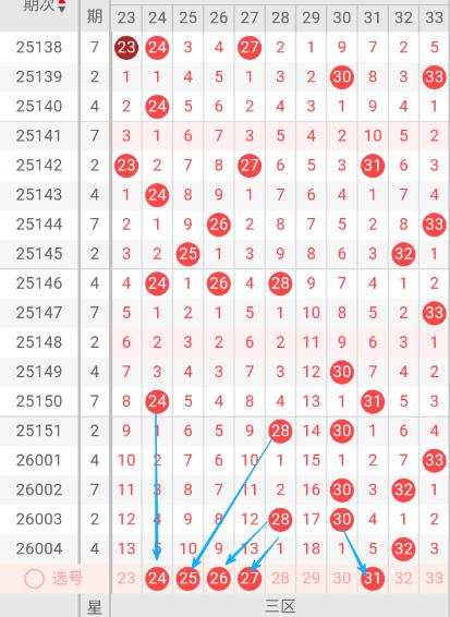 根据走势图可以看出当前区,145期开出25.32二个号码球 ,146期开出24.26.28三个号码球 ,147期开出33一个号码球 ,148期没有开出号码球 ,149期开出30一个号码球 ,150期开出24.31二个号码球 ,001期开出33一个号码球 ,002期开出30.32二个号码球 ,003期开出28.30二个号码球 ,004期开出32一个号码球 ,按照如此规律判断本期当前区可能开出1单1双。我们看下当前区上期没有开出重叠号,那么本期当前区要定重叠号的情况下可关注32码球。再看下当前区上期没有开出斜连号,当期选号得留意31斜连号。本区重点关注23.24.26.27.31