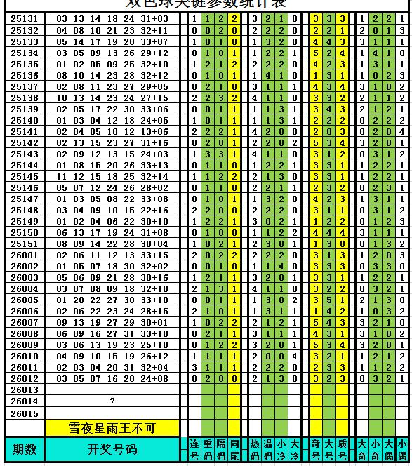 以下是作者手工统计的双色球关键参数统计表,对喜欢参数分析、过滤缩水、选号胆杀的技术性双色球爱好者有所帮助,其它读者可略过不看。