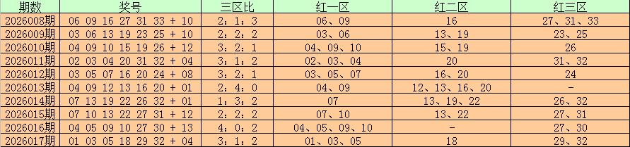 双色球第2026017期奖号为:010305182932+04,红球三区比为3:1:2。