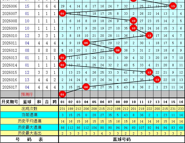 蓝球:历史同期0路号开出:06、09、15;1路号开出;01、04、07、13、16;2路号开出;02、05、11,蓝球012路个数比为8:10:5,当前1路号历史同期轮空1年,今年同期注意1路号出现,参考号码01。