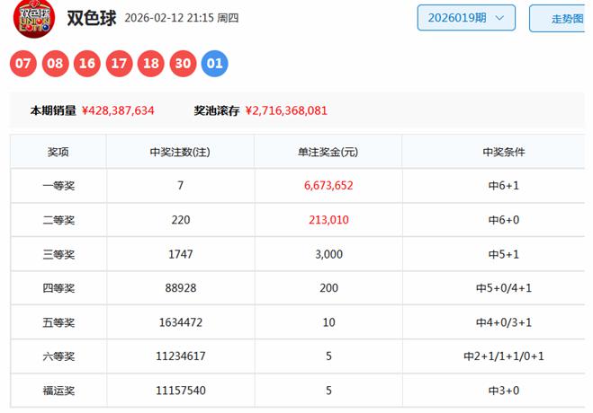 开奖回顾:第2026019期双色球奖号为07、08、16、17、18、30+01。区间比:2:3:1,奇偶比:2:4,首尾间距:23。