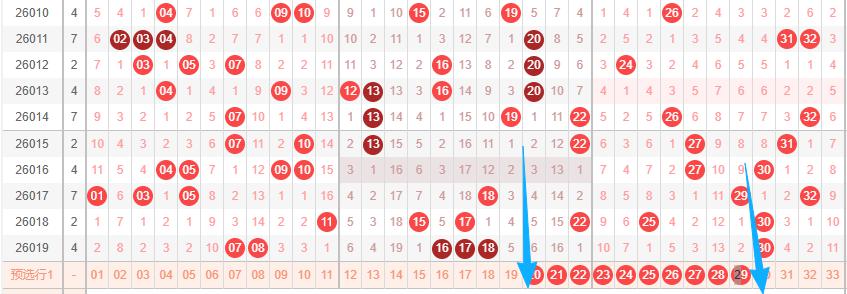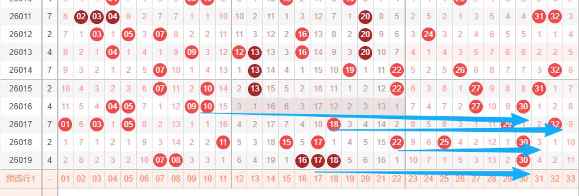 上图是福彩双色球红球开奖号码走势分布图,我在上面走势图中标注出来的蓝色箭头右边这个区域的数字最近出现的连号组合出现的少,从数字18到数字33这个区域的数字连续12期没出现过连号组合,这个区域的数字一共有16个,这16个数字连续12期没出现过连号组合,那么大家要留意这个区域出连号组合一组或者两组,大家还要看看四连号,因为四连号很久没出现过了。
