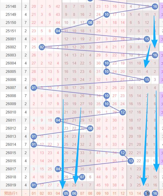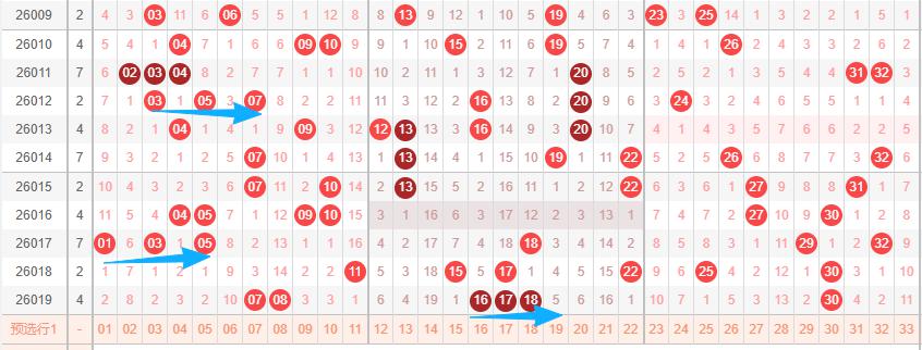 上图是福彩双色球红球开奖号码走势分布图,我在上面走势图中标注出来的蓝色小箭头表示的就是最近开出的跨度二组合,上期开出跨度二组合1618,最近几期开出的跨度二组合比较少,那么本期跨度二组合还是要留意留意的。