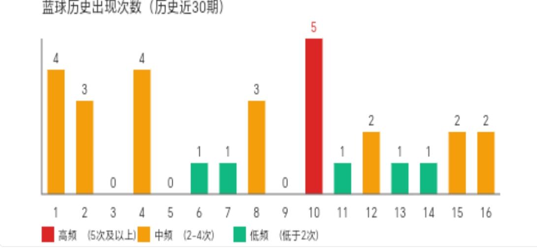 >蓝球分析:上期蓝球为6,属于偶数,我们分析近30期蓝球偶数发现偶数占多数,我们建议本期重点关注7、9,偶数可关注2、6