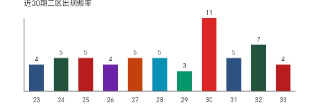 >三区红球分析(23 - 33号):我们发现27在近30期出现次数较多(均出现5次以上)、29在近30期出现次数较多(均出现3次以上)、30在近30期出现次数较多(均出现11次以上),从奇偶性统计看,近30期三区奇数出现44.8%,偶数出现55.2%,偶数占据主导,建议重点关注偶数号码,本期三区建议从27、29、30中选号