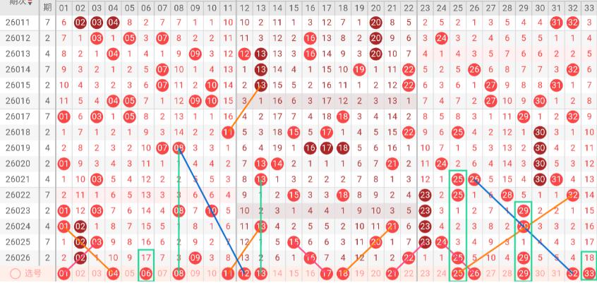 出号轨迹呈现单期爆发后连续平量的特征。在一期4枚后,连续四期稳定在2枚,显示出极强的控盘能力。三区继续维持2-3枚的概率较高。建议关注号码:25、26、29、32、33。