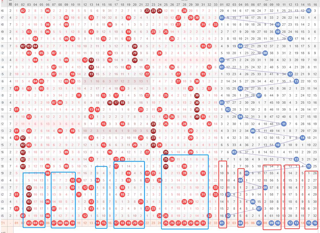 第6位,基本在24-33之间,历史同期频次最多的31-33;近30期,频次最多的为30-32,明显特征是合数优势;推荐重24-28-29-30-31-32-33。