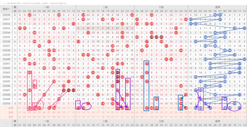 上一期三区开出了1个号码,本期三区大概率不会断区,本期不考虑断三区的情形,本期三区出号数量看好1个,最多2个;本期三区需要关注的号码:29为隔期码;28-29可能一起落号;34可能重开;此外遗漏值较低的27-35,可能落号;因此区本期选号范围为27-28-29-34-35等号码。