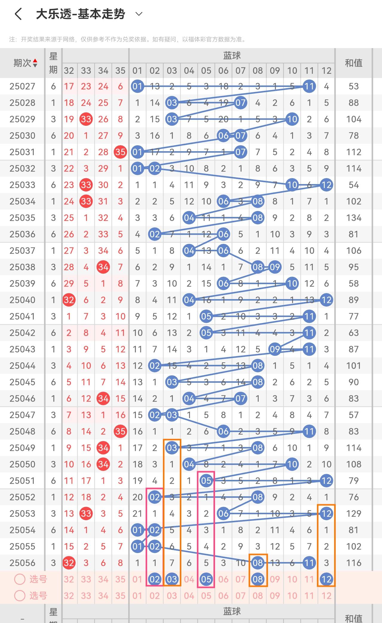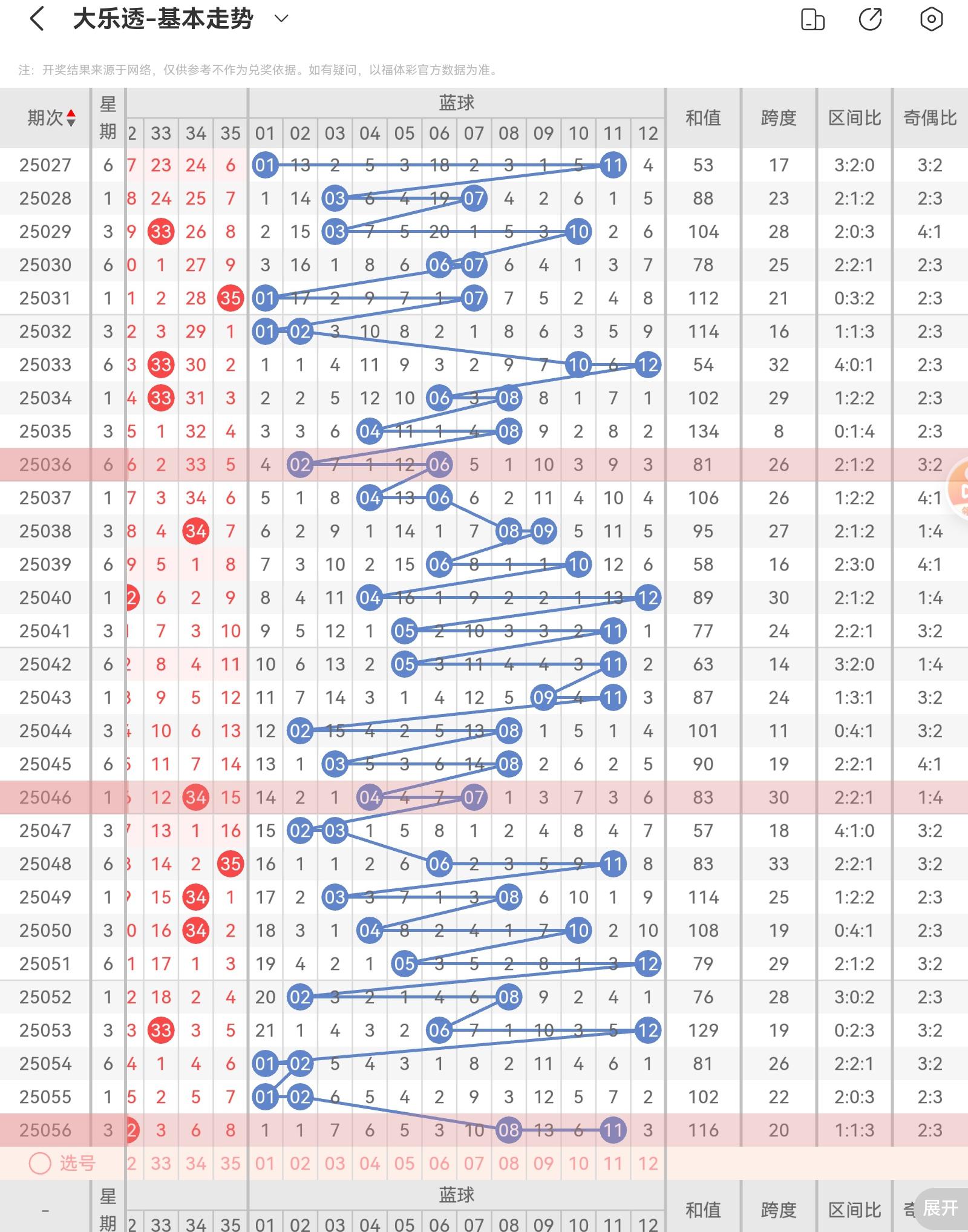 >蓝球上期(25056期)开出了08-11,开出了一奇一偶组合出号,连续三期开出了一奇一偶组合出号,本期需要注意是会继续开出一奇一偶组合出号还是会开出两奇或者两偶组合出号,且开出了后端两个大号号码,本期需要注意是会继续开出后端两个大号号码组合还是会开出一大一小组合出号或者开出前端两个小号号码组合出号,本期蓝球首先需要关注的号码【02】隔期回补号码带对称形态,然后是【03】七期回补号码,其次是【05】五期回补号码,【08】重号带对称形态,【12】三期回补号码,本期蓝球重点关注号码【02 03 05 08 12】