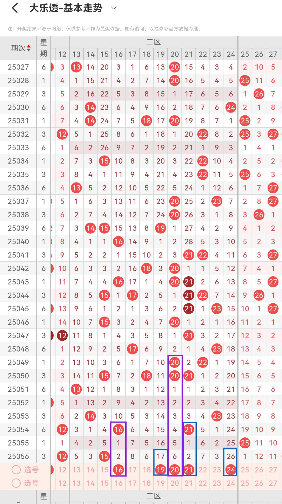 >二区间上期(25056期)开出了一码15,开出了独码,本期做号需要注意独码位置能否有落码,以及空白区域号码回补落码,从近期该区间上开出的独码来看,在25051期开出独码后下期独码放了空,在25053期开出独码后下期独码放了空,在25054期开出独码后下期独码放了空,本期独码位置号码需要仔细研判考虑,本期首先需要关注的号码【16】两期回补号码带对称形态,然后是【19】十七期回补号码,其次是【20】重号六期回补号码,【21】两期回补号码带对称形态,【24】二十六期回补号码,本期重点关注号码【16 19 20 21 24】