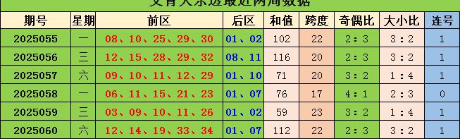 最近5期后区奇偶走势为:偶奇-奇偶-奇奇-奇偶-奇奇,