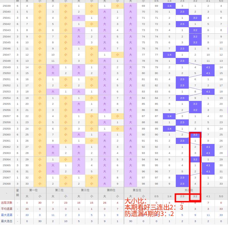 上期大小比:2:3,近10期大小比出现情况:1:4、3:2、2:3、4:1、4:1、3:2、4:1、4:1、2:3、2:3,最近10期出现2期3:2,出现3期2:3,出现4期4:1,出现1期1:4,出现0期5:0,出现0期0:5,根据近10期规律本期看好三连出2:3,防遗漏4期的3:2,综上所述推荐大小比推荐:3:2,重点关注:2:3。